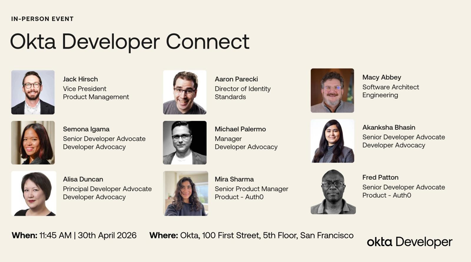 Okta Developer Connect San Francisco is a half-day event for developers, platform engineers, security architects, product leaders, and engineering teams building at the intersection of identity and AI.