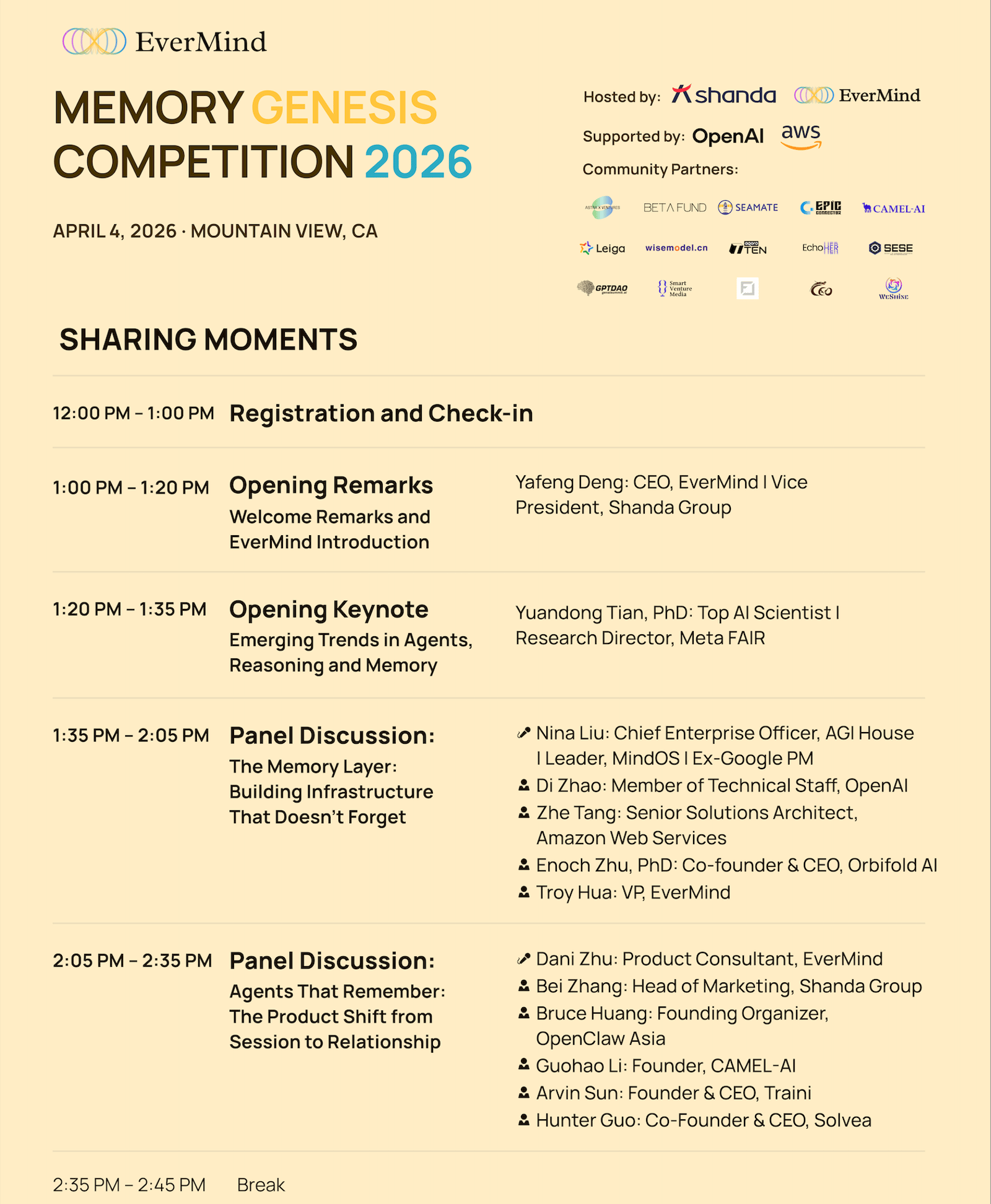 โJoin us on April 4 for a full day of demos, panels, and awards - bringing together the brightest minds building the future of AI memory.