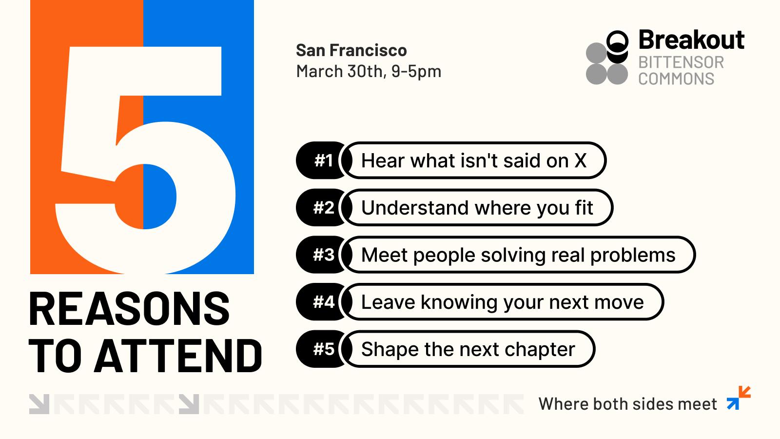 Bittensor is an open, decentralized network that uses incentives to coordinate independent contributors to build useful AI systems at scale. Breakout creates a shared space to examine how that system grows - from both perspectives at once.
