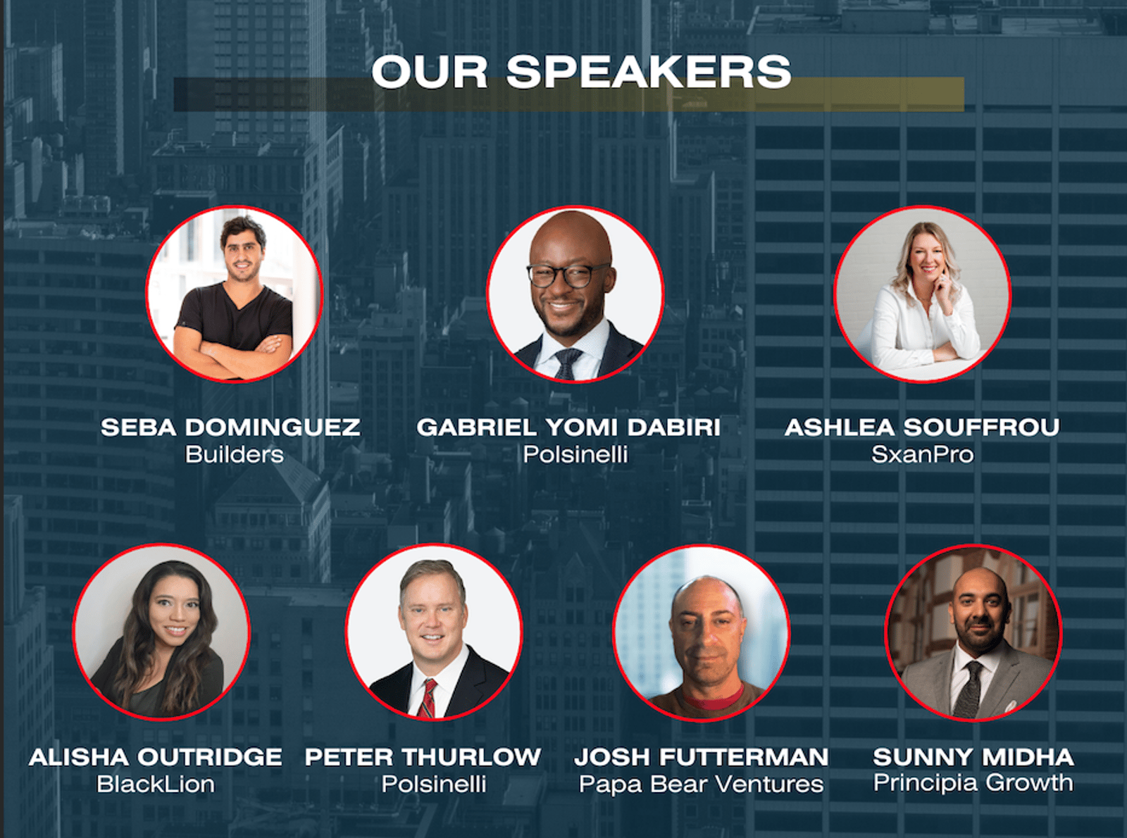Speakers from Polsinelli Law Firm, Papa Bear Ventures, Black Lion (ex-Meta, SXSW Speaker), Builders (investor, advisor), SxanPro (Crain's 40 under 40), Sunny Midha (Principia Growth)(Investor, M&A, Series B+)