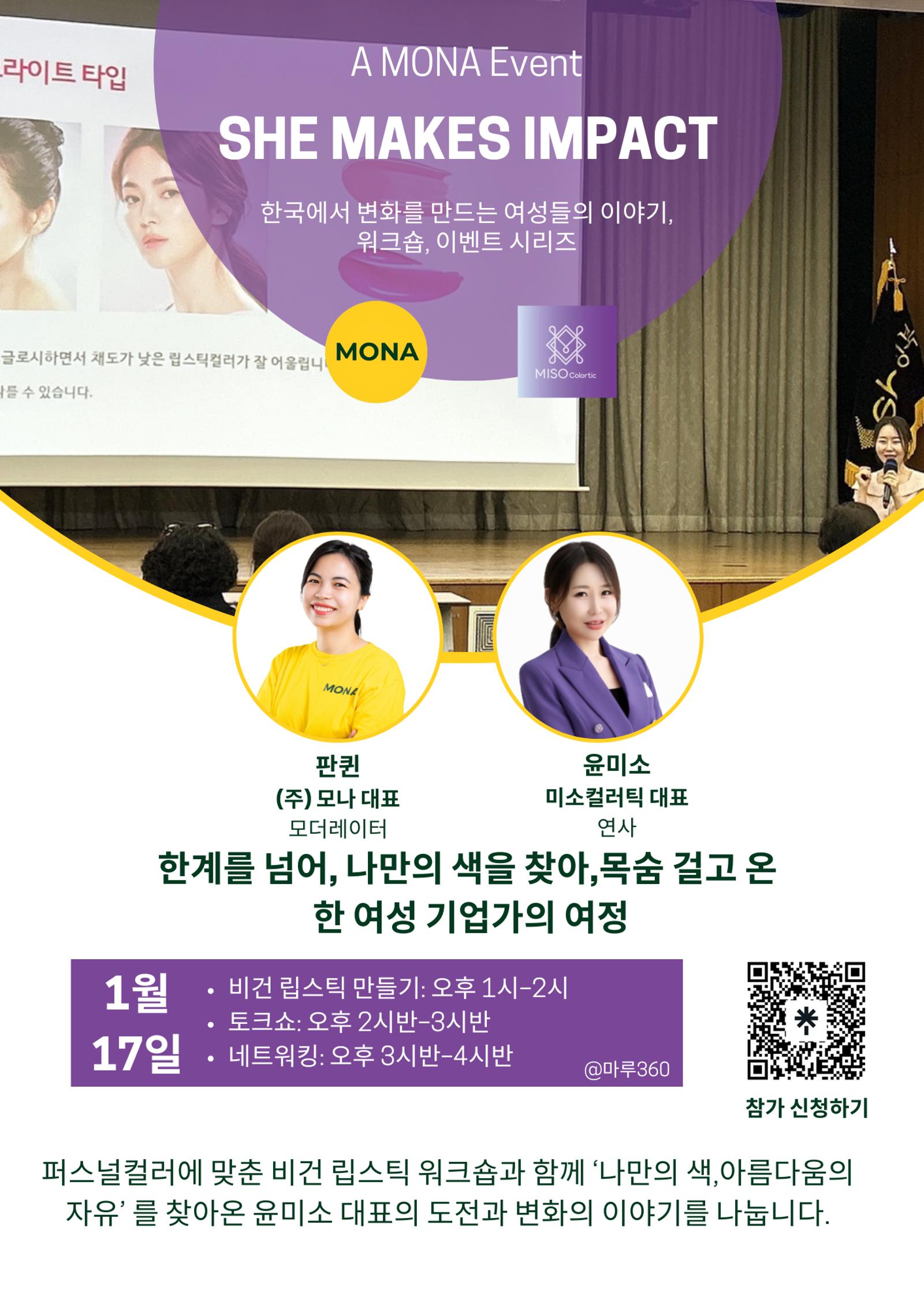 Join us for a powerful evening of creativity, courage, and self expression at SHE MAKES IMPACT, a MONA event series that highlights women who create meaningful change in Korea.
