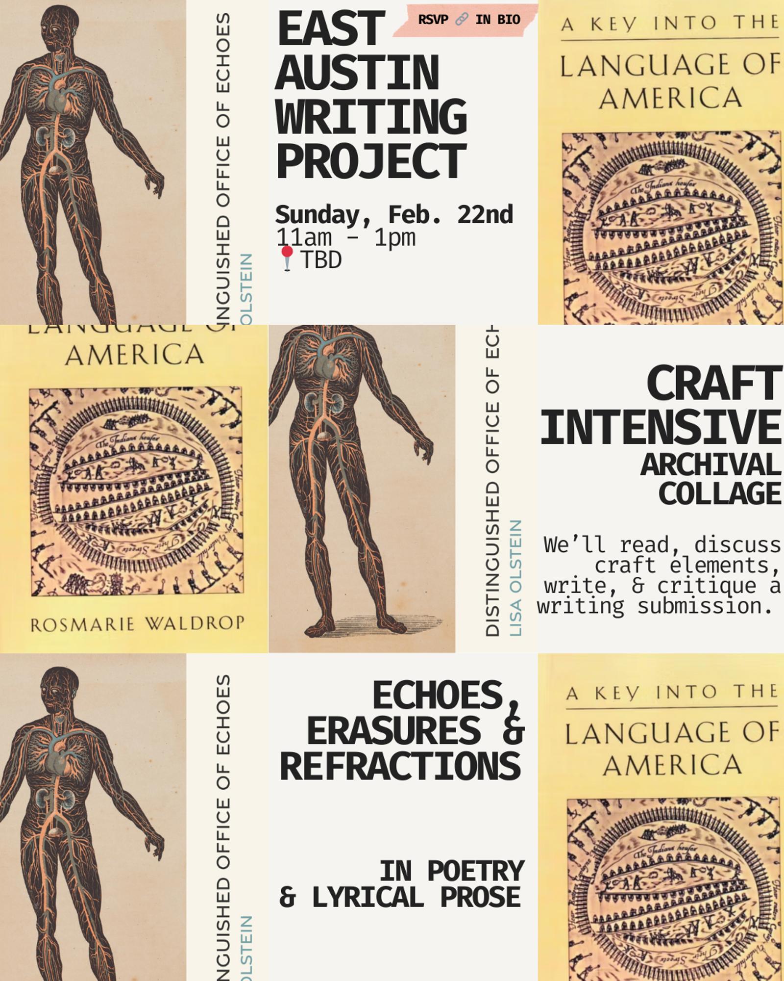 In-person craft intensive in East Austin exploring the transformation of archival language through echo, erasure, and refractive lyric strategies. We’ll read excerpts from A Key into the Language of America by Rosemarie Waldrop and Distinguished Office of Echoes by Lisa Olstein. Hosted by East Austin Writing Project (Austin, TX).