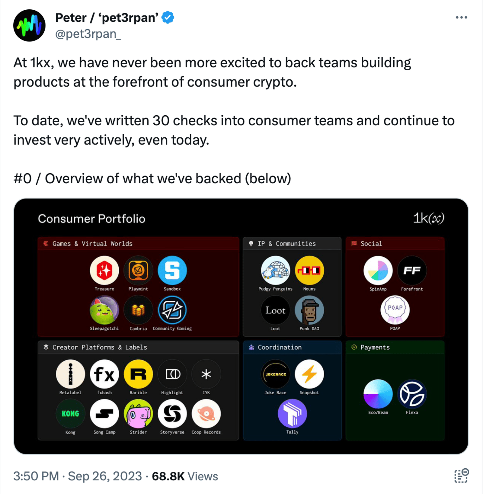 Peter 'pet3rpan' is a Partner at 1kx, a renowned crypto venture fund, with a primary focus on investing in consumer-oriented crypto projects. With an extensive and influential presence in the crypto space, Peter is a well-known figure in the Web3 community. In fact, if you're already part of the Web3 space, there's a good chance you're already following Peter on Twitter. For those who have yet to do so, it's a valuable resource well worth following to stay updated on valuable insights in the world of crypto and Web3.