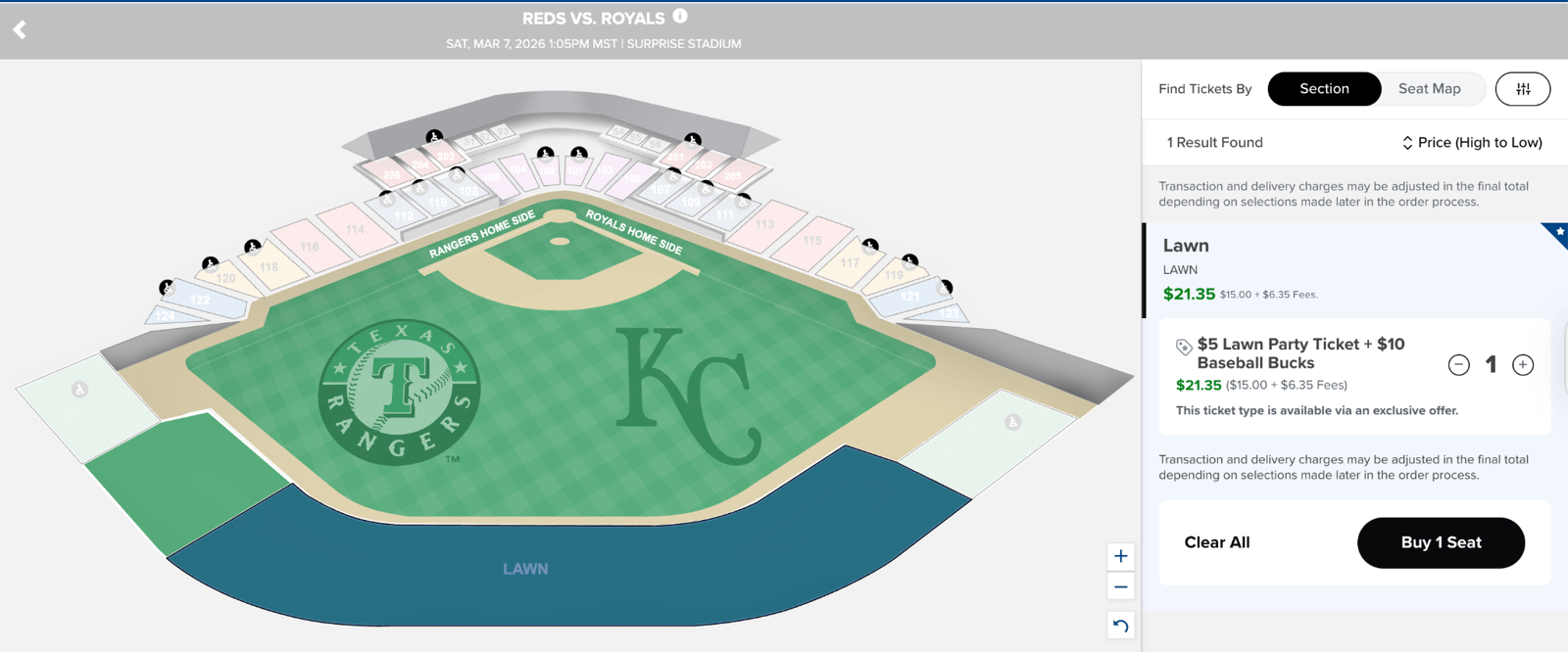 ⚾ General lawn seat admission to the Cincinnati Reds vs. Kansas City Royals Spring Training game at Surprise Stadium
