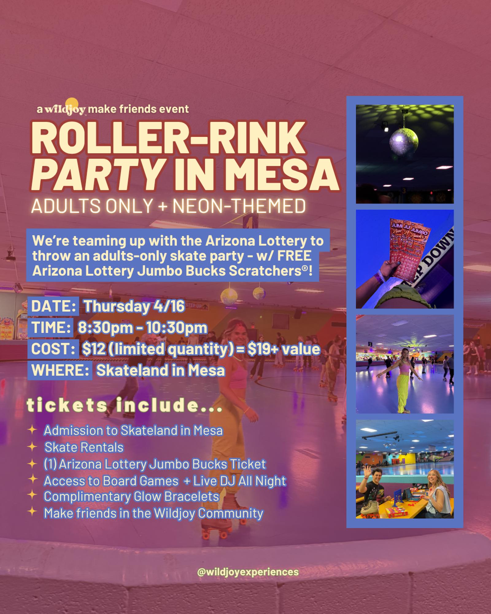 ​What’s up, Joy Club! For our next Make Friends event, nothing screams nostalgia more than a night at the roller rink…. so we’re taking over Skateland in Mesa for an adults-only Roller Rink Neon Party! And to make it even more fun - we’re teaming up with the Arizona Lottery to give every attendee their brand new FREE Jumbo Bucks Lottery Ticket.Â