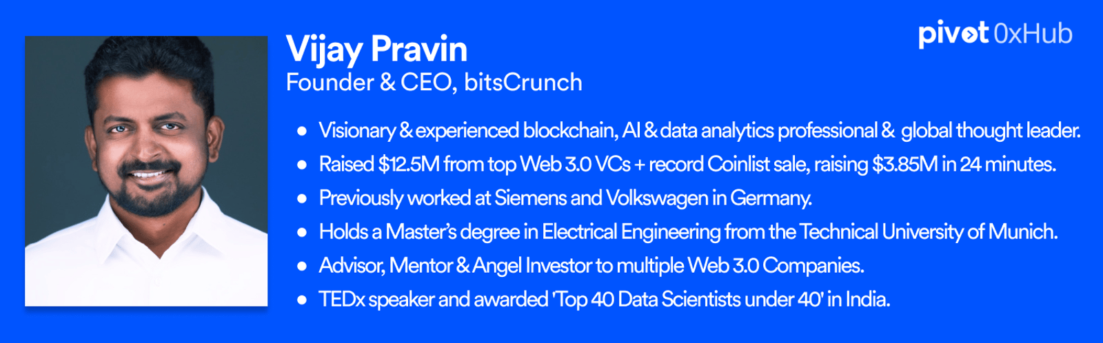 Vijay Pravin is a visionary and experienced professional in blockchain, AI, and data analytics, recognized globally for his thought leadership. He successfully raised $12.5 million from top Web 3.0 venture capitalists for his firm, bitsCrunch, and achieved a record Coinlist sale, raising $3.85 million in just 24 minutes. His extensive experience includes significant roles at Siemens and Volkswagen in Germany. Holding a Master’s degree in Electrical Engineering from the Technical University of Munich, Vijay also serves as an advisor, mentor, and angel investor, supporting multiple Web 3.0 companies. Recognized as a TEDx speaker and one of the 'Top 40 Data Scientists under 40' in India, his contributions significantly advance the sector.