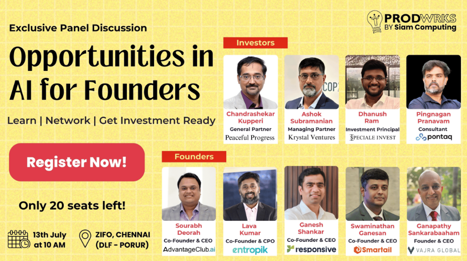 ProdWrks Publication is thrilled to invite you to dynamic panel discussions on Opportunities in AI for Founders, taking place on Saturday, July 13th from 10:00 am to 12:30 pm at Zifo RnD Solutions in Chennai (DLF IT Park, Porur).