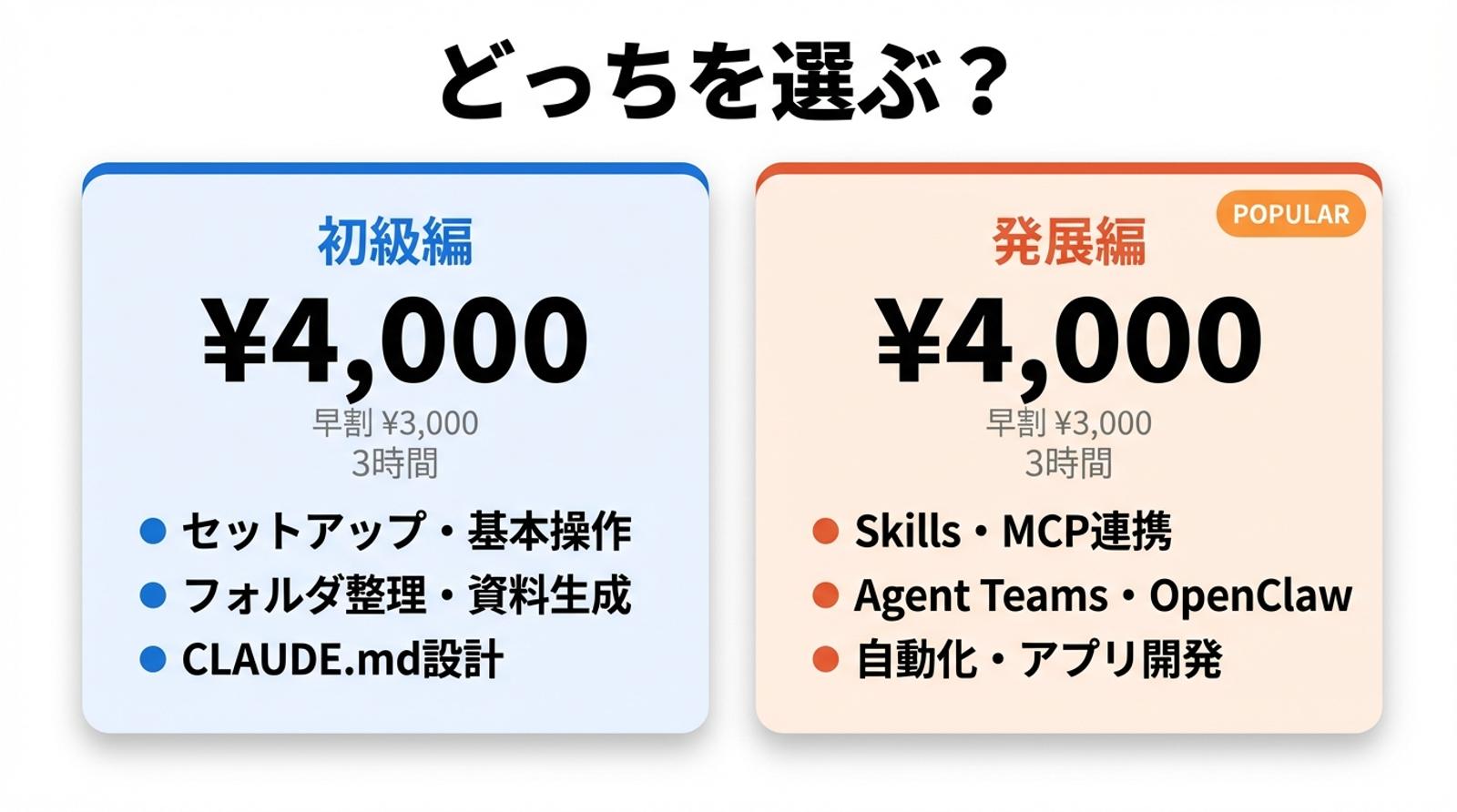 当日はClaude Codeが動く状態で進行します。初級編を受講済みでない方は、事前動画でセットアップと基本操作を済ませてからご参加ください。