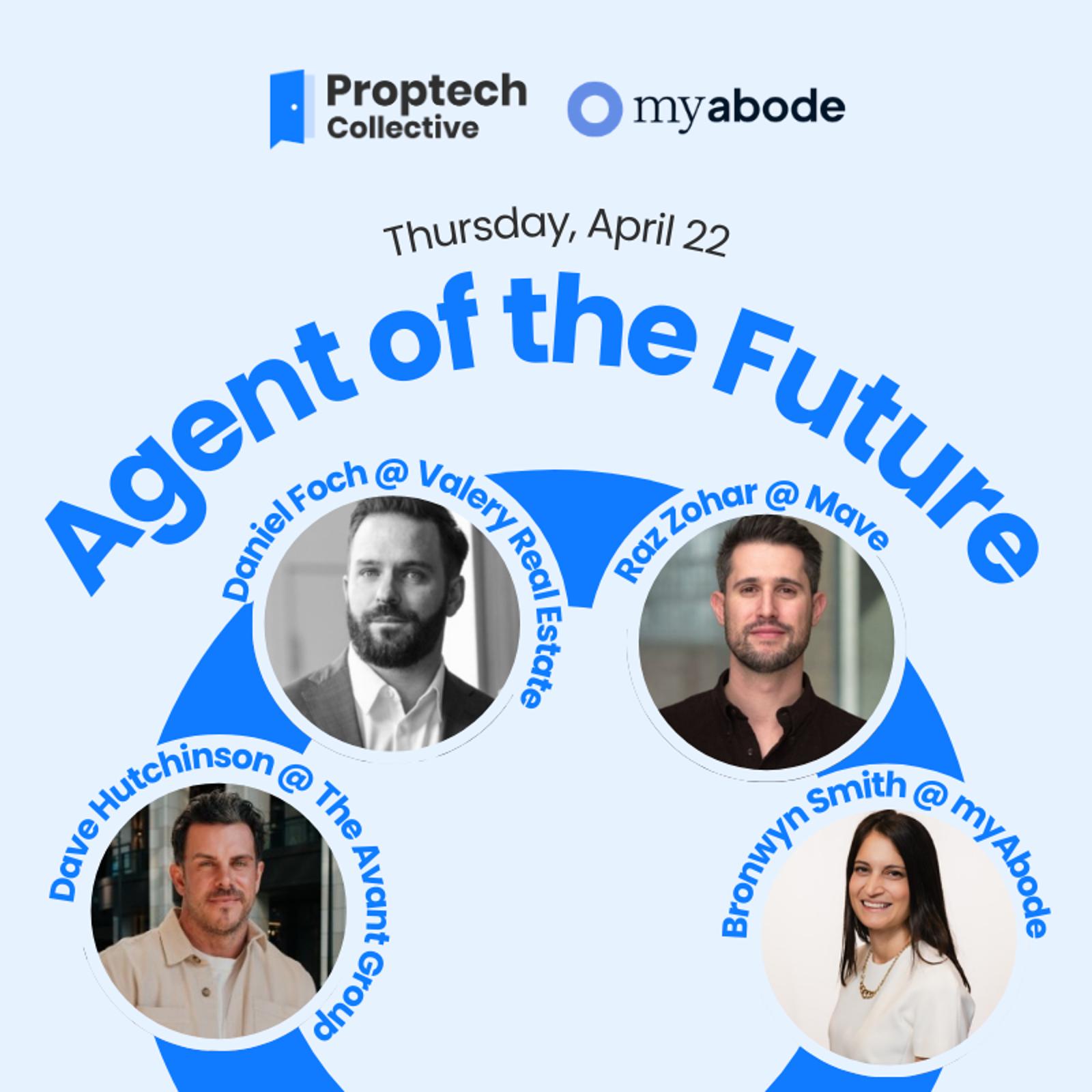 We have David Hutchinson from The Avant Group bringing the on-the-ground agent perspective, Daniel Foch from Valery Real Estate speaking to what this all means at the brokerage level, and Raz Zohar from Mave on what the tools of tomorrow actually look like in practice, with Bronwyn Smith from myAbode moderating — and together they'll be responding live to predictions submitted by the audience on what a real estate agent's day-to-day will look like in 3–5 years.
