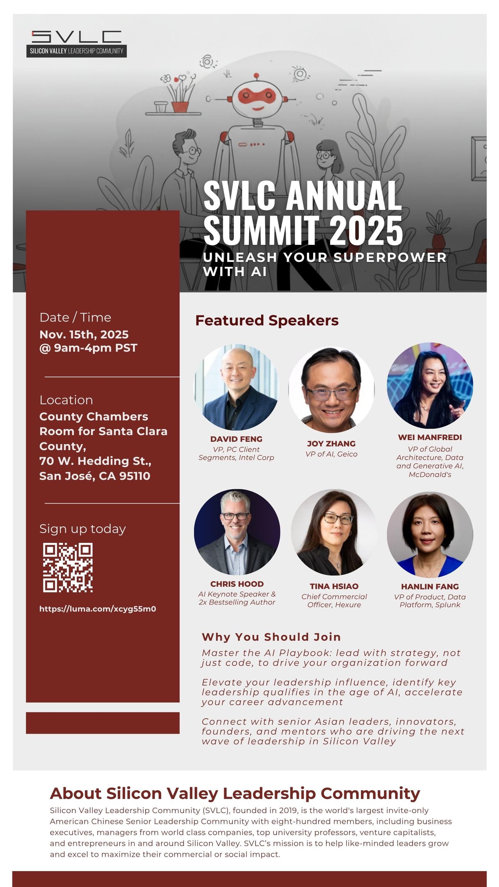 The SVLC Annual Summit brings together Silicon Valley’s most visionary leaders, innovators, and change-makers. This year’s theme — Unleash Your Superpower with AI — will spark bold conversations on how executives can lead with clarity and confidence in an age of disruption.