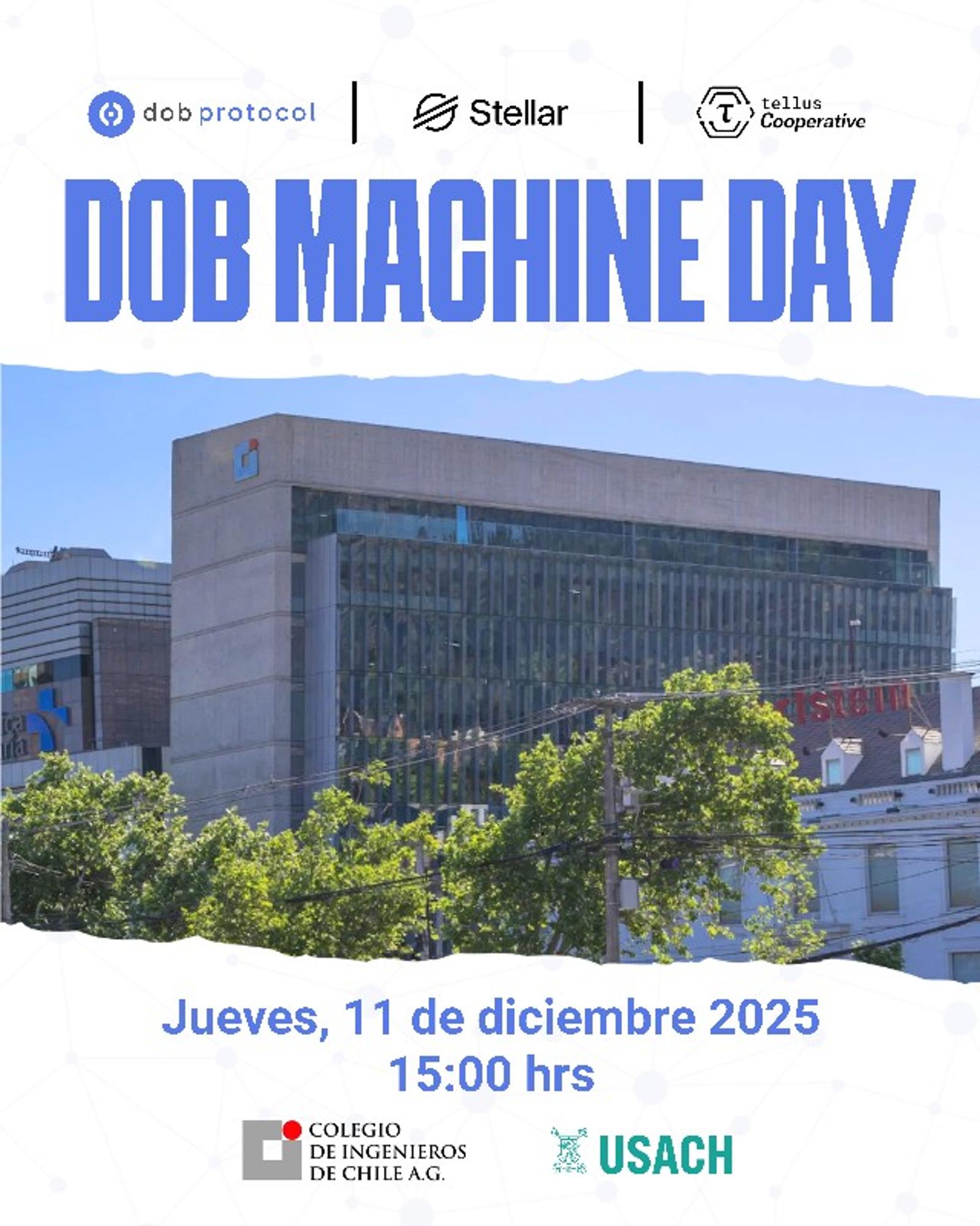 Dobprotocol, con el apoyo del Consejo de Especialidad de Computacion e Informatica del Colegio de Ingenieros, Tellus Cooperative y Stellar, organiza por primera vez en Chile el DOB Machine Day 2025, un encuentro que reunirá a ingenieros, emprendedores, inversionistas, líderes del mundo público y privado, y a la comunidad Web3 en torno a una de las transformaciones tecnológicas y financieras más profundas de nuestra era: la economía de las máquinas.