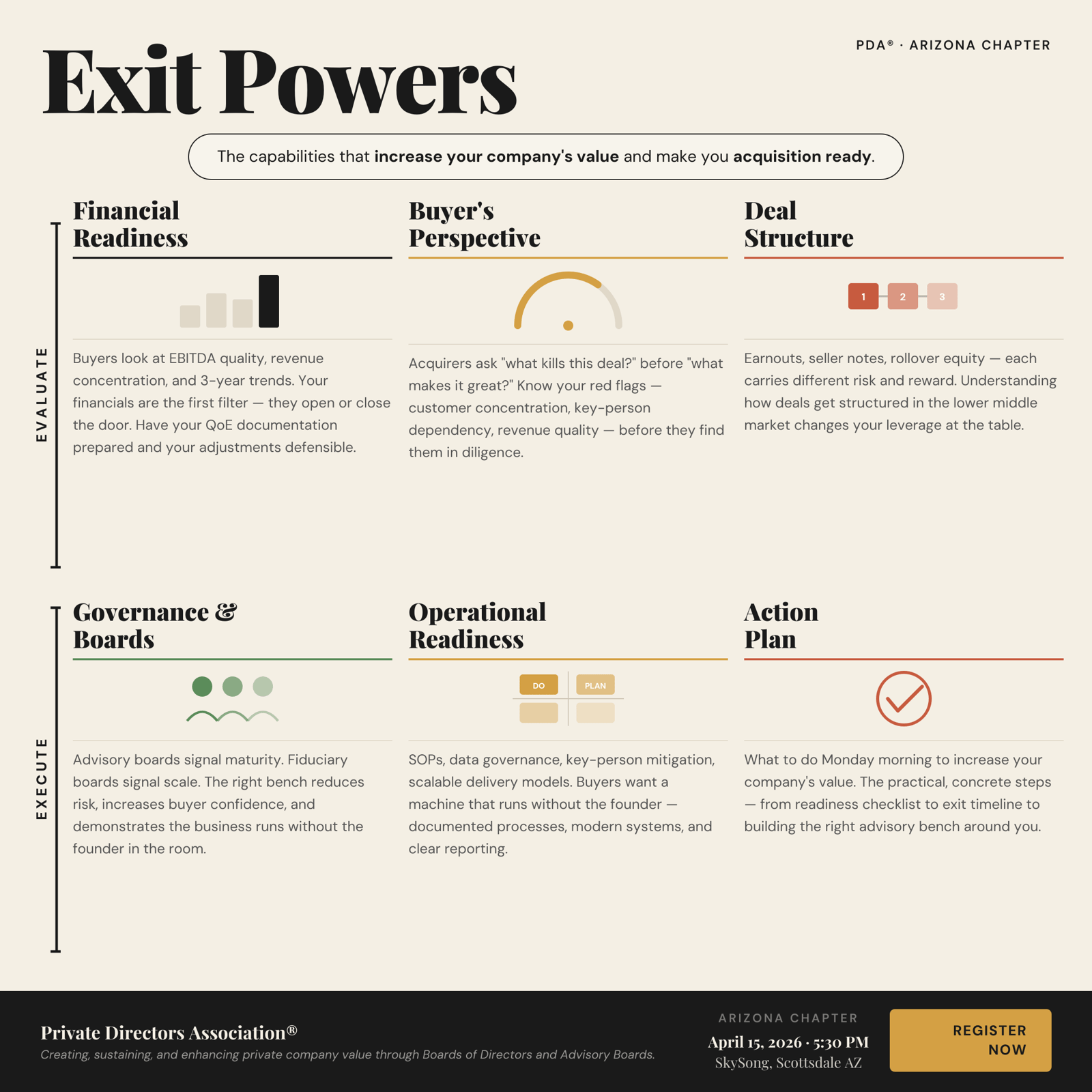 Join the Private Directors Association® Arizona Chapter for an evening with M&A practitioners, PE investors, and operators who have collectively evaluated and closed hundreds of lower middle market transactions. This isn't theory - it's a direct conversation about what buyers actually look for, what kills deals, and what you can do now to strengthen your position.
