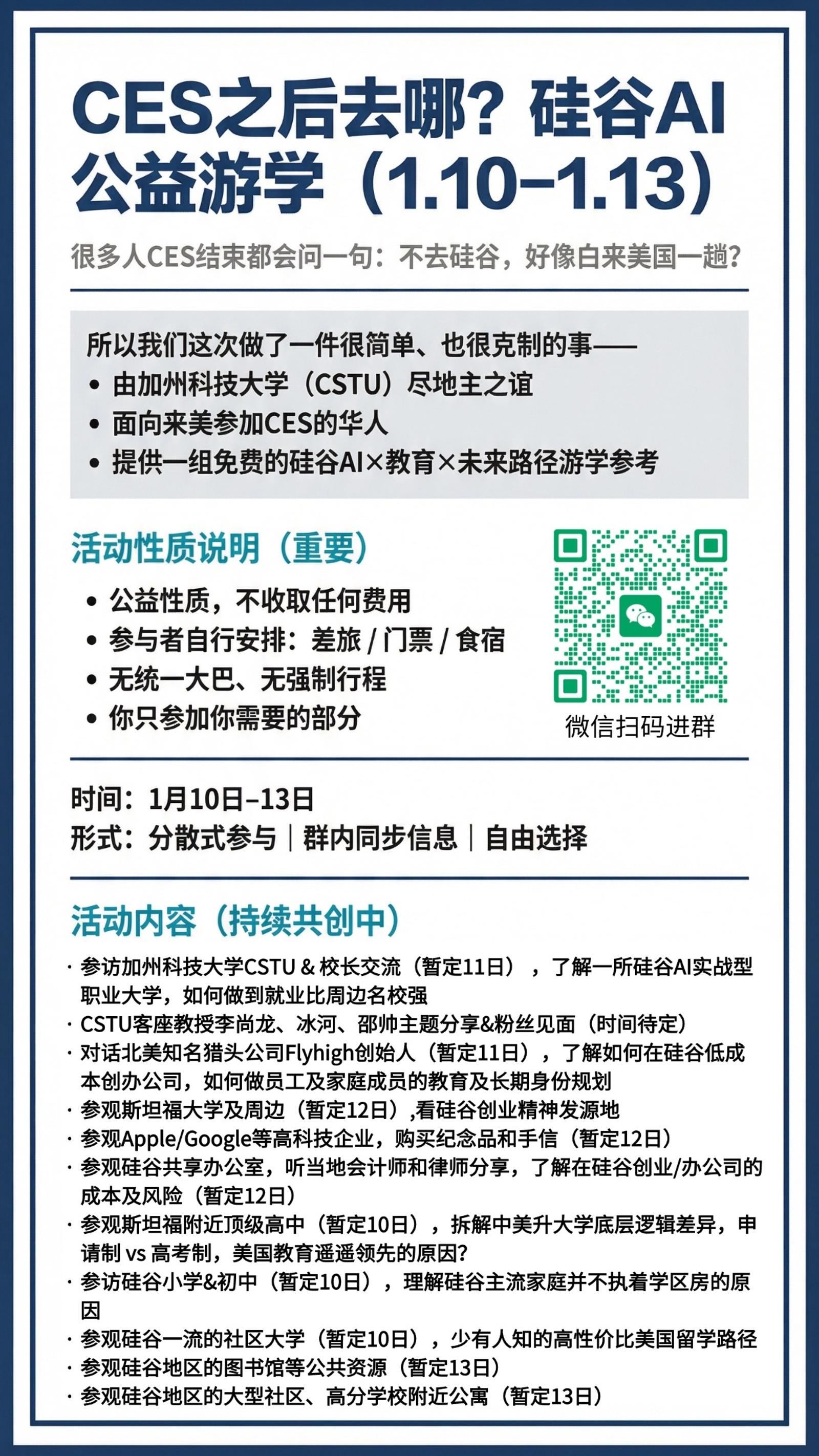 所以我们这次做了一件很简单、也很克制的事—— 👉 由加州科技大学(CSTU)尽地主之谊 👉 面向来美参加CES的华人 👉 提供一组免费的硅谷AI×教育×未来路径游学参考