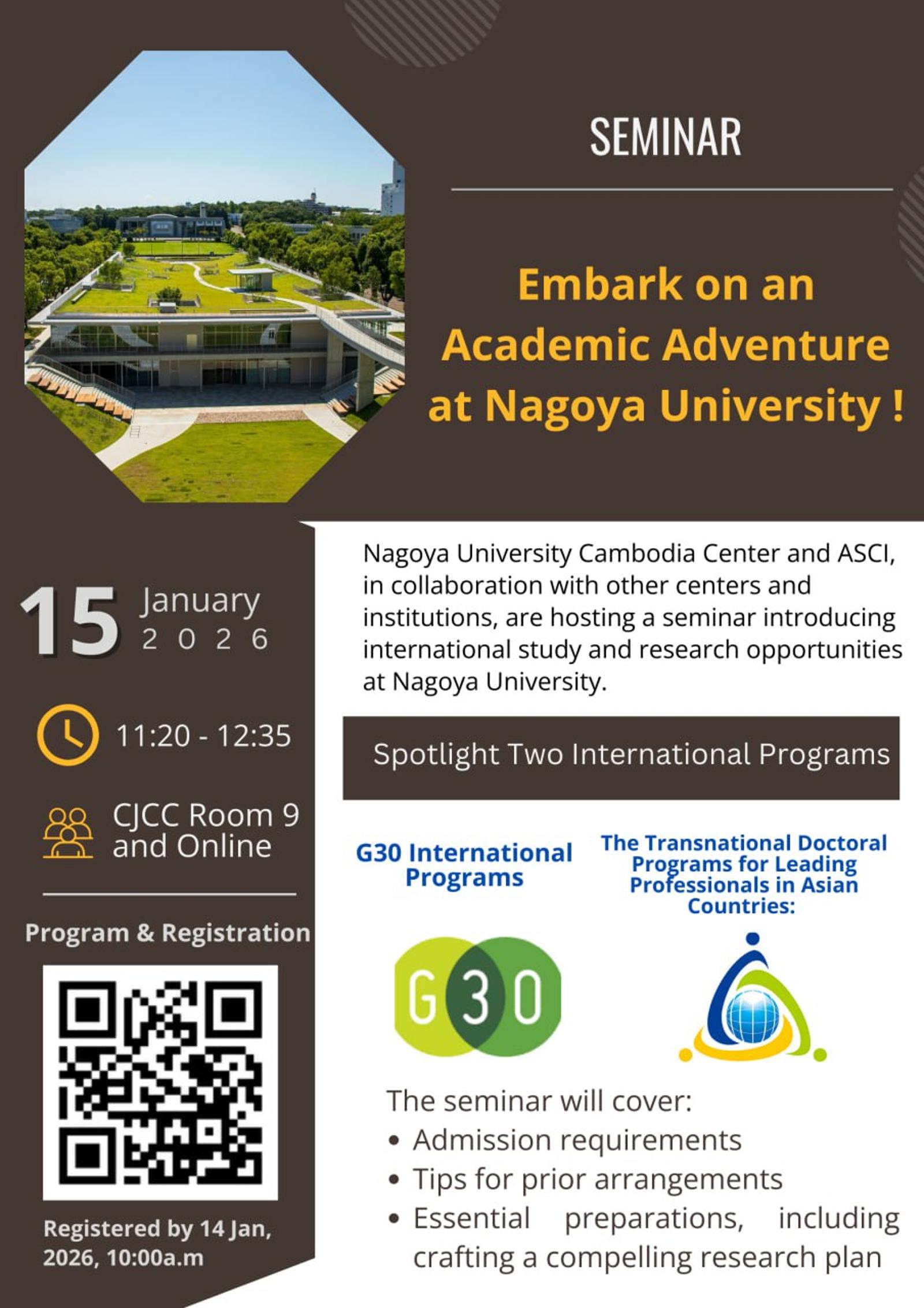 Join us for an exciting promotion seminar "Embark on an Academic Adventure at Nagoya University!" hosted by the Nagoya University Cambodia Center and Asia Satellite Campuses Institute (ASCI), in collaboration with the Global Engagement Center (GEC) of the Global Multi-Campus Institute (GMC), Graduate School of Law (GSL), and Graduate School of International Development (GSID). This event is your gateway to discovering Nagoya University’s international programs tailored specifically for Cambodian students and researchers.