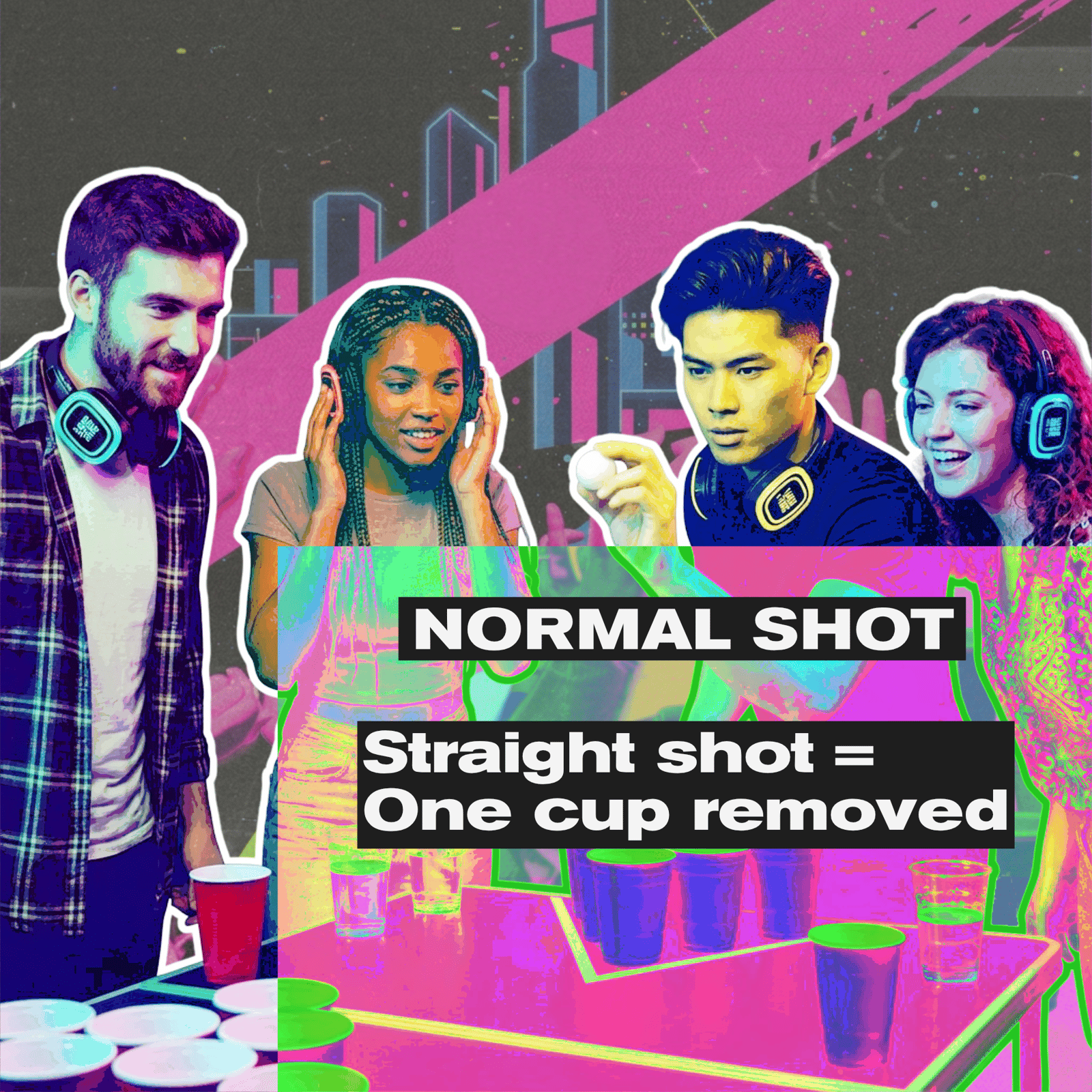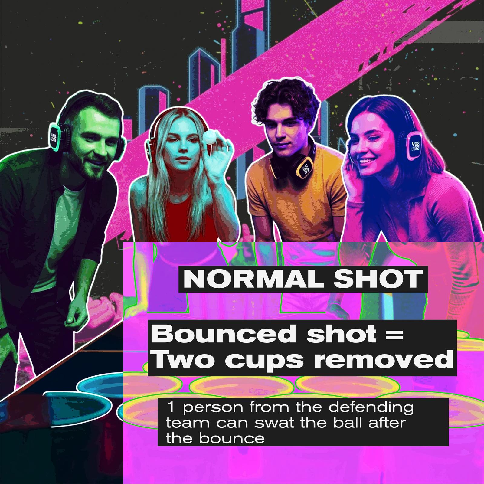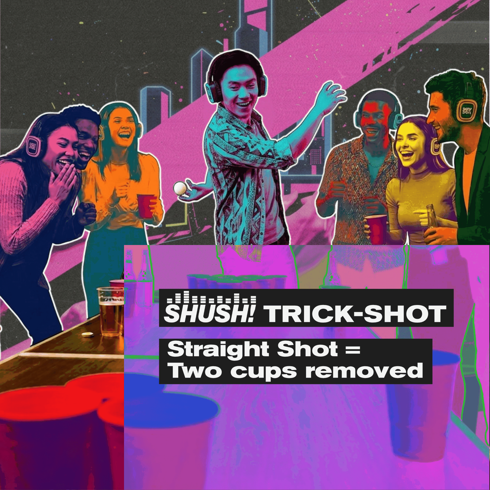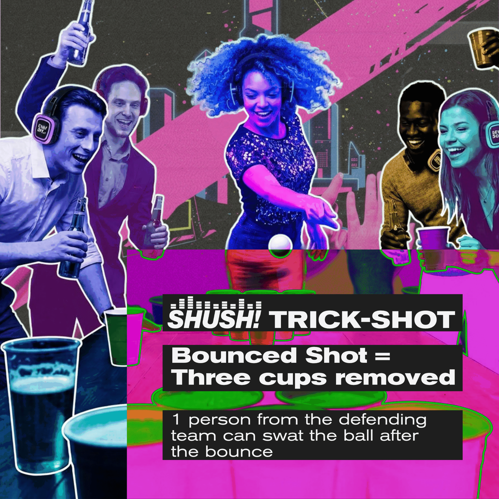 βTake your usual beer pong shots, or go for the SHUSH! Trick Shot. Put on a silent disco headset, pick a DJ channel, and improvise a short dance that ends with a twist immediately before throwing -