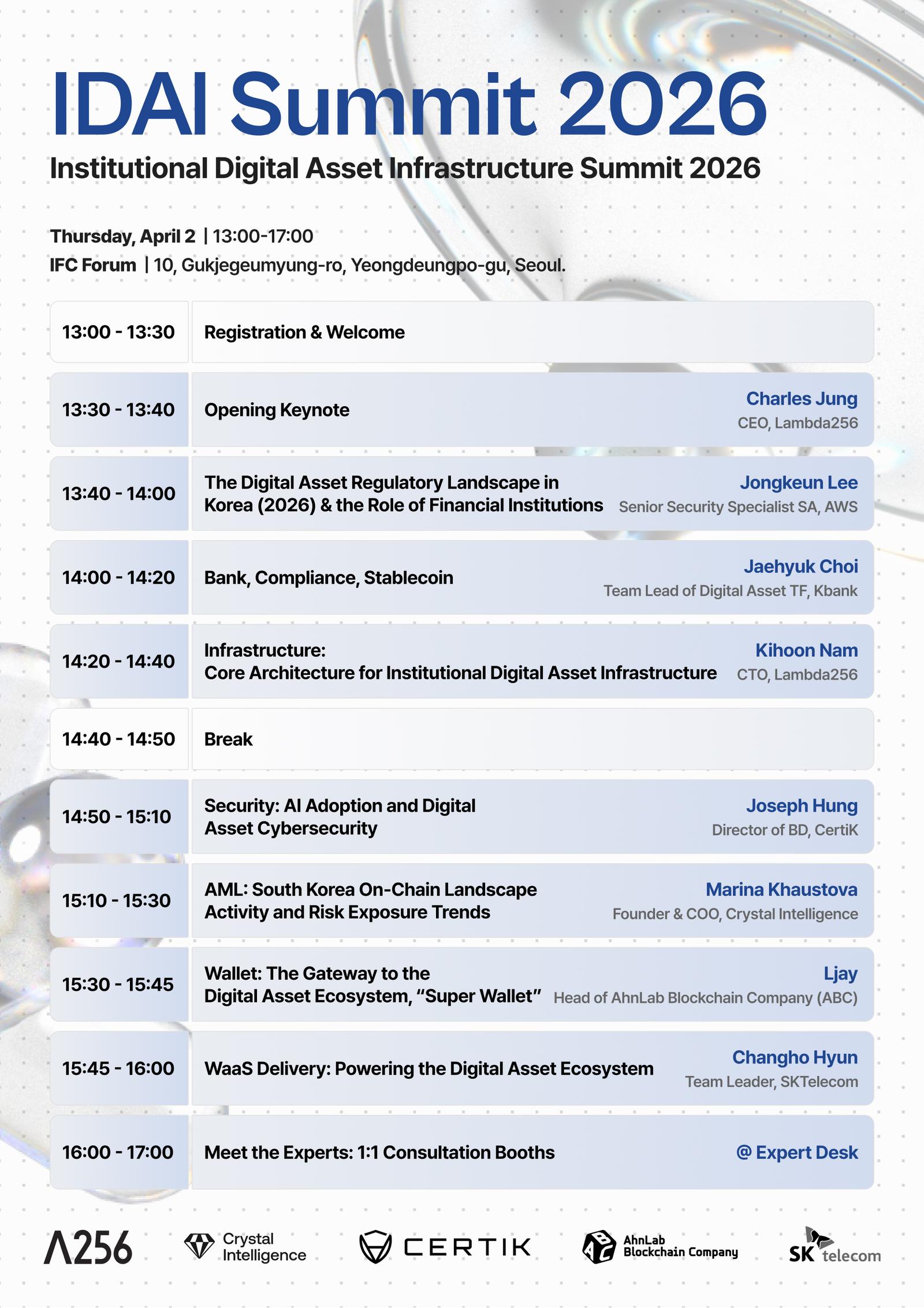 IDAI 2026, co-hosted by Lambda256, Crystal Intelligence, CertiK, AhnLab Blockchain Company (ABC) and SKTelecom(SKT), provides a palce for experts across these domains to share insights on regulatory developments, operational experience, and infrastructure design principles shaping Korea’s digital asset ecosystem. The event will also feature 1:1 consultation sessions with domain experts for more in-depth discussions.
