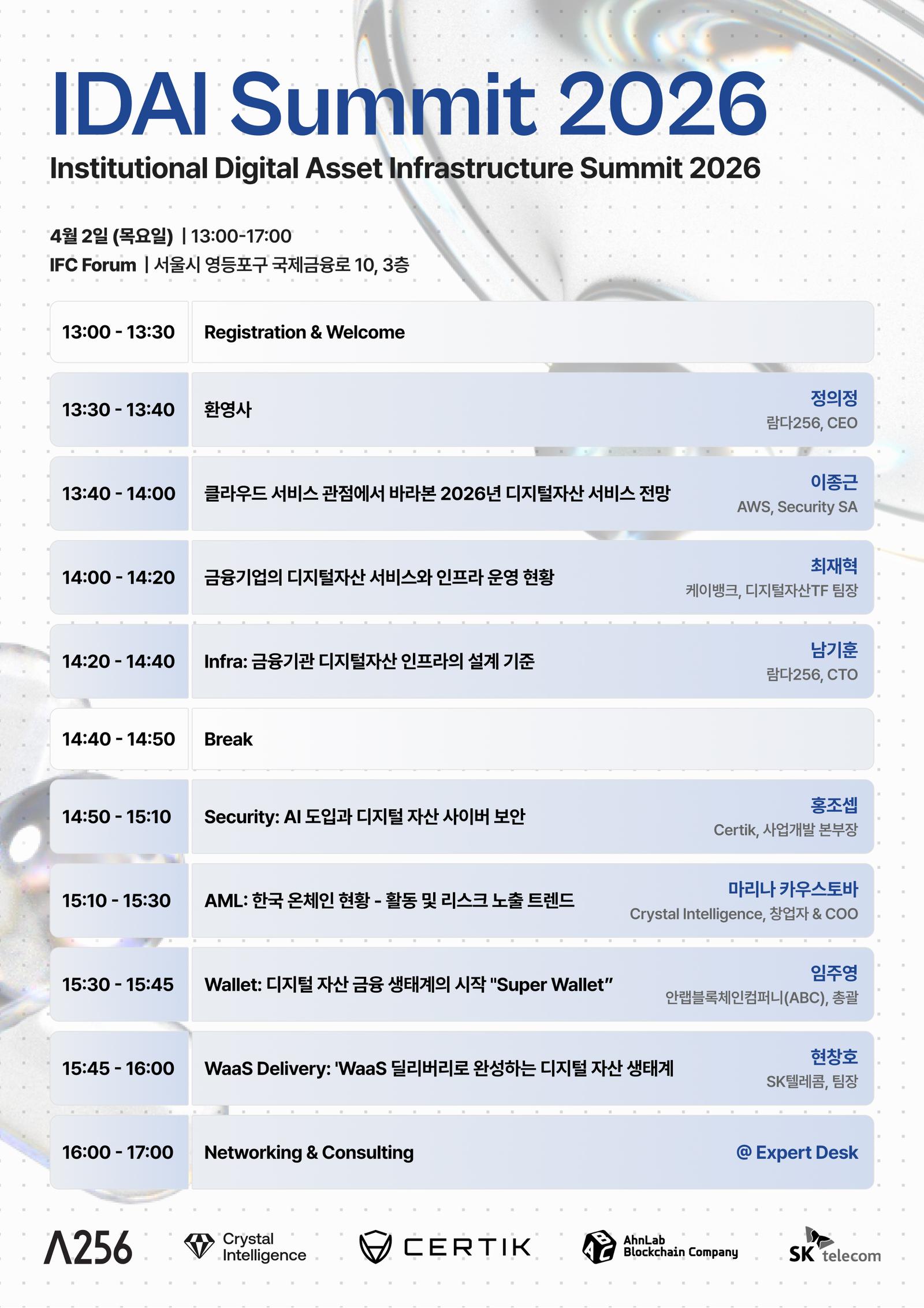 람다256, Crystal Intelligence, CertiK, 안랩블록체인컴퍼니(ABC)와 SK텔레콤(SKT)이 공동 주최하는 IDAI 2026은 이 질문에 답하기 위한 자리입니다. 각 분야 전문가들이 제도 환경과 실제 운영 사례를 바탕으로 2026년 국내 디지털 자산 산업의 방향성과 인프라 설계 기준을 공유하며, 현장에서는 분야별 전문가와의 1:1 상담 세션도 운영됩니다.