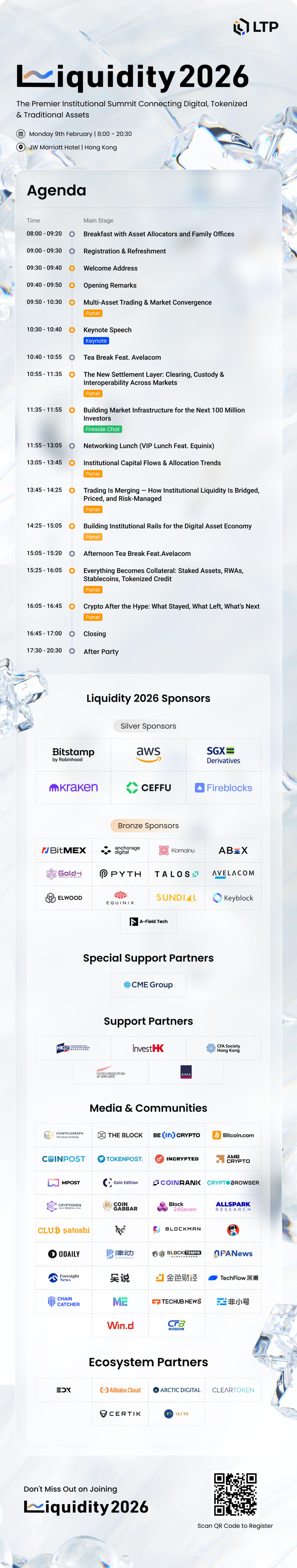 Welcome to the 「Liquidity 2026」 Institutional Summit, the fourth edition of our flagship event, hosted by LTP's HK subsidiary, LiquidityTech Limited, on February 9, 2026, in Hong Kong. Over the years, Liquidity has evolved from an Institutional Digital Asset Summit into The Premier Institutional Summit Connecting Digital, Tokenized & Traditional Assets — reflecting the industry’s shift toward a multi-asset future.