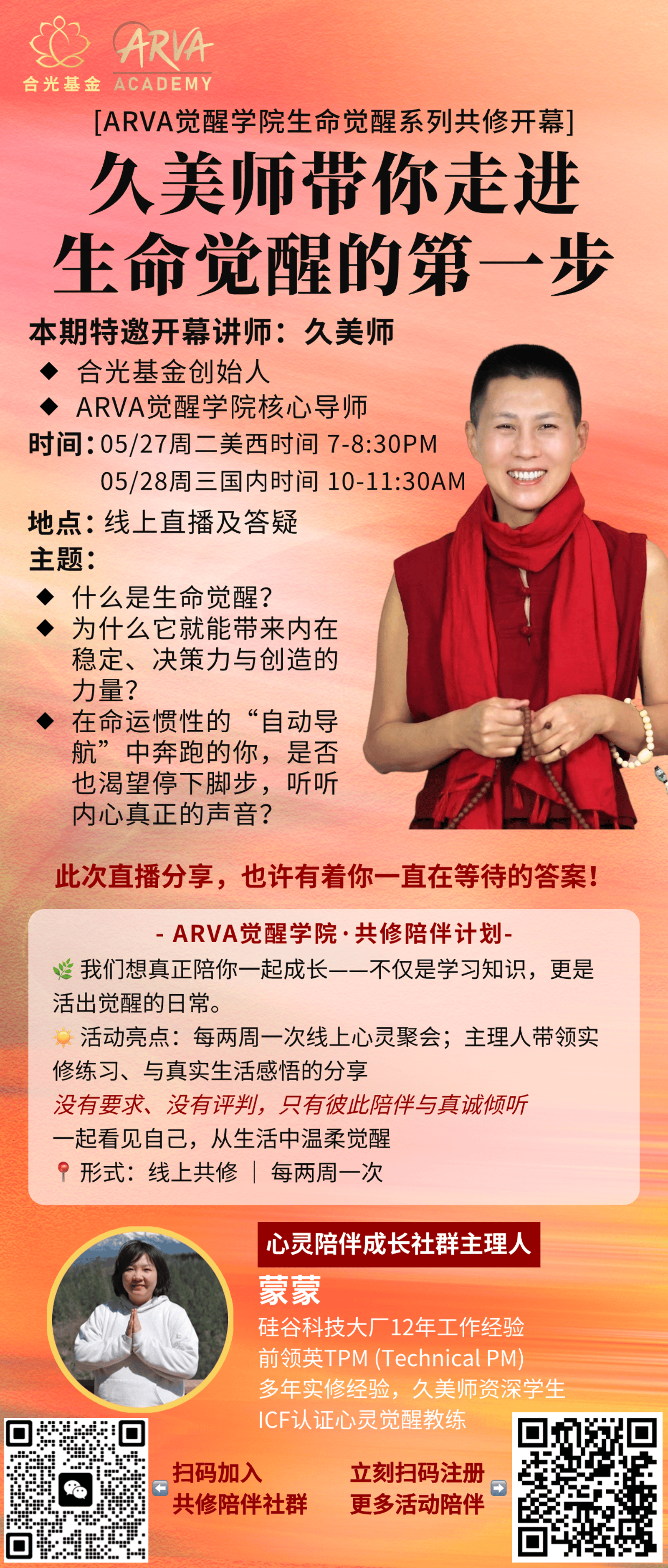 本次直播为觉醒学院生命觉醒系列的一部分,由久美师亲自特别带领,带你走进生命觉醒的第一步。除此之外,觉醒学院将推出共修陪伴计划,平时由ARVA Coach蒙蒙担任常规带领人,引导大家在生活中持续实践与深化内在成长。