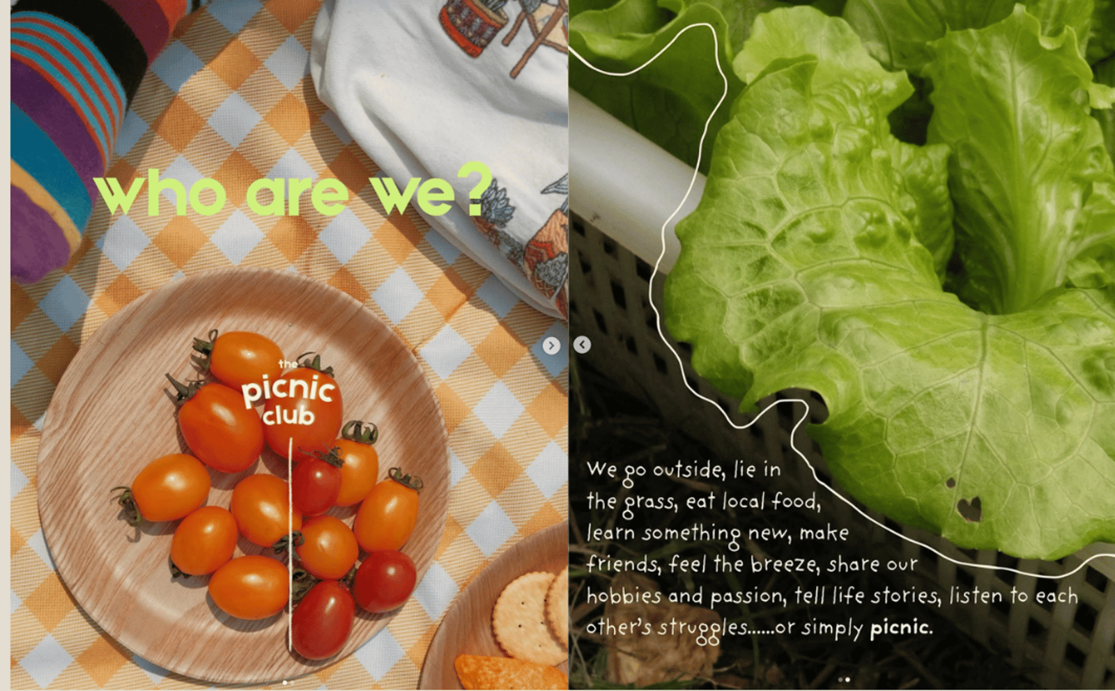 「野餐俱樂部」致力於打造獨特的戶外野餐體驗,善用城市中的公共空間,結合本地新鮮農產品與多元特色活動,推廣本地農業,拉近城市人與本地農業的距離,促進身心靈健康。我們與本地農夫及廚師合作,選用當季食材,呈現從農場到野餐的美味饗宴。