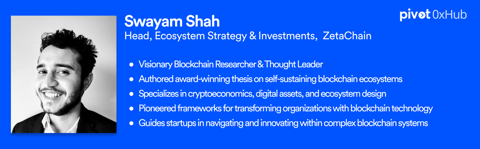 Swayam Shah, has a deep background in computer science, and specializes in cryptoeconomics & ecosystem design. His notable work, "A Framework for Designing Self-Sustaining Ecosystems with Blockchain," recognized as the Best Blockchain Research Thesis in the Netherlands, serves as a blueprint for building intelligent, self-sustaining ecosystems. Swayam’s insights help organizations navigate complex systems, driving innovation and value within the blockchain ecosystem. He currently Heads Ecosystem Strategy & Investments at ZetaChain