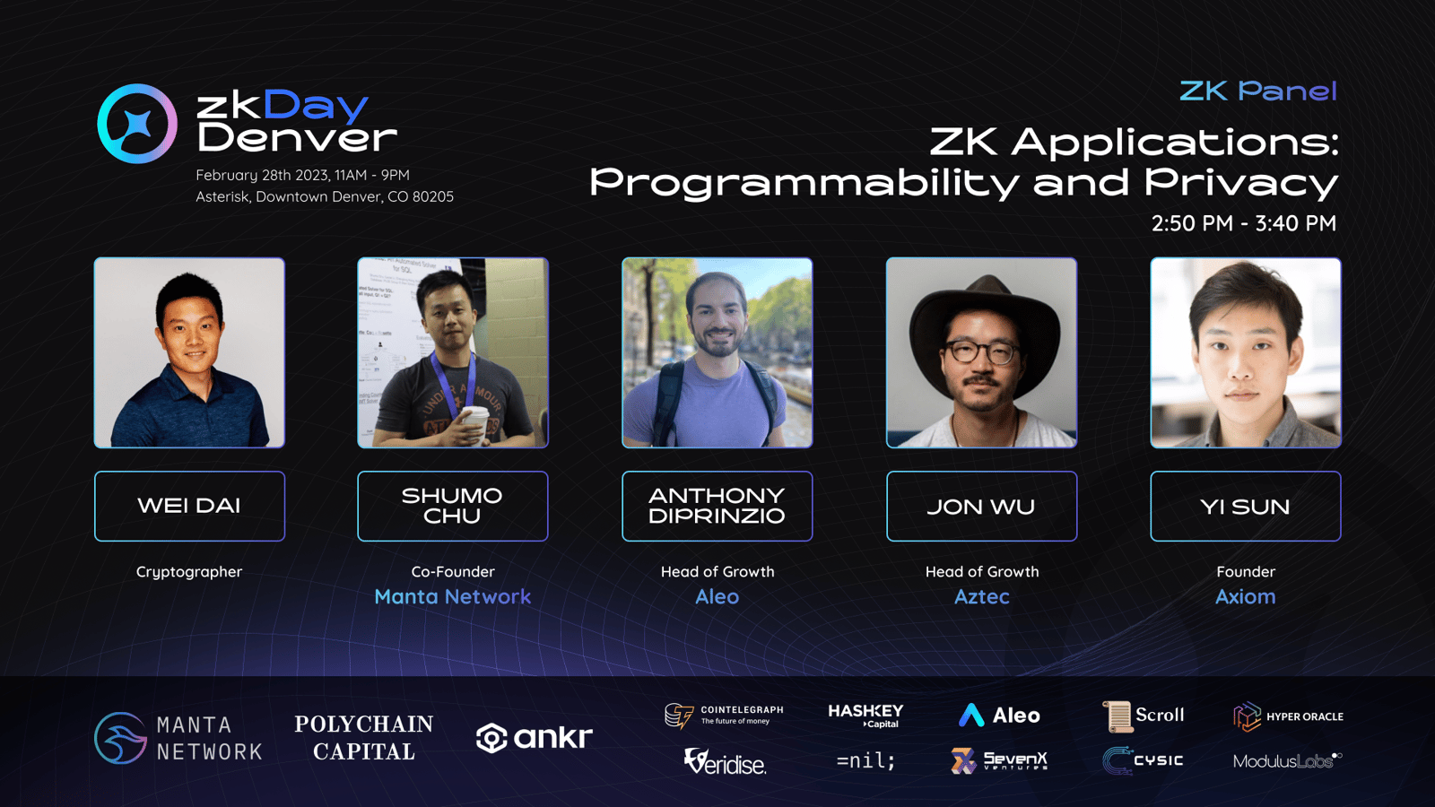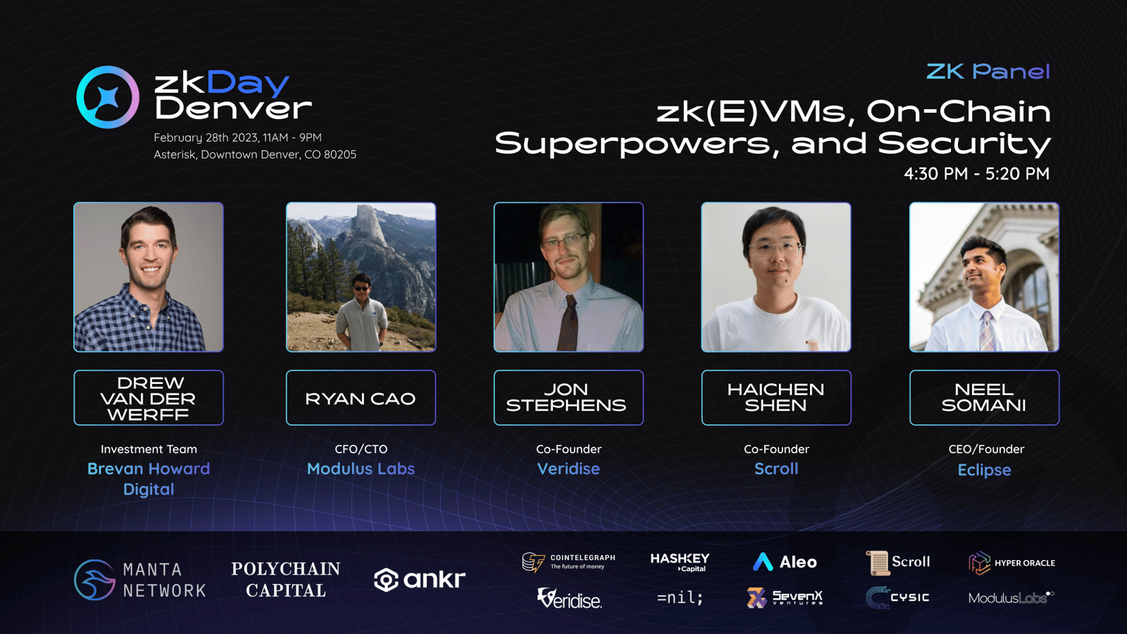 Sponsored and supported by Scroll, Aleo, Veridise, Nil, Cysic, Modulus Labs, Hyper Oracle, and other amazing ZK projects.