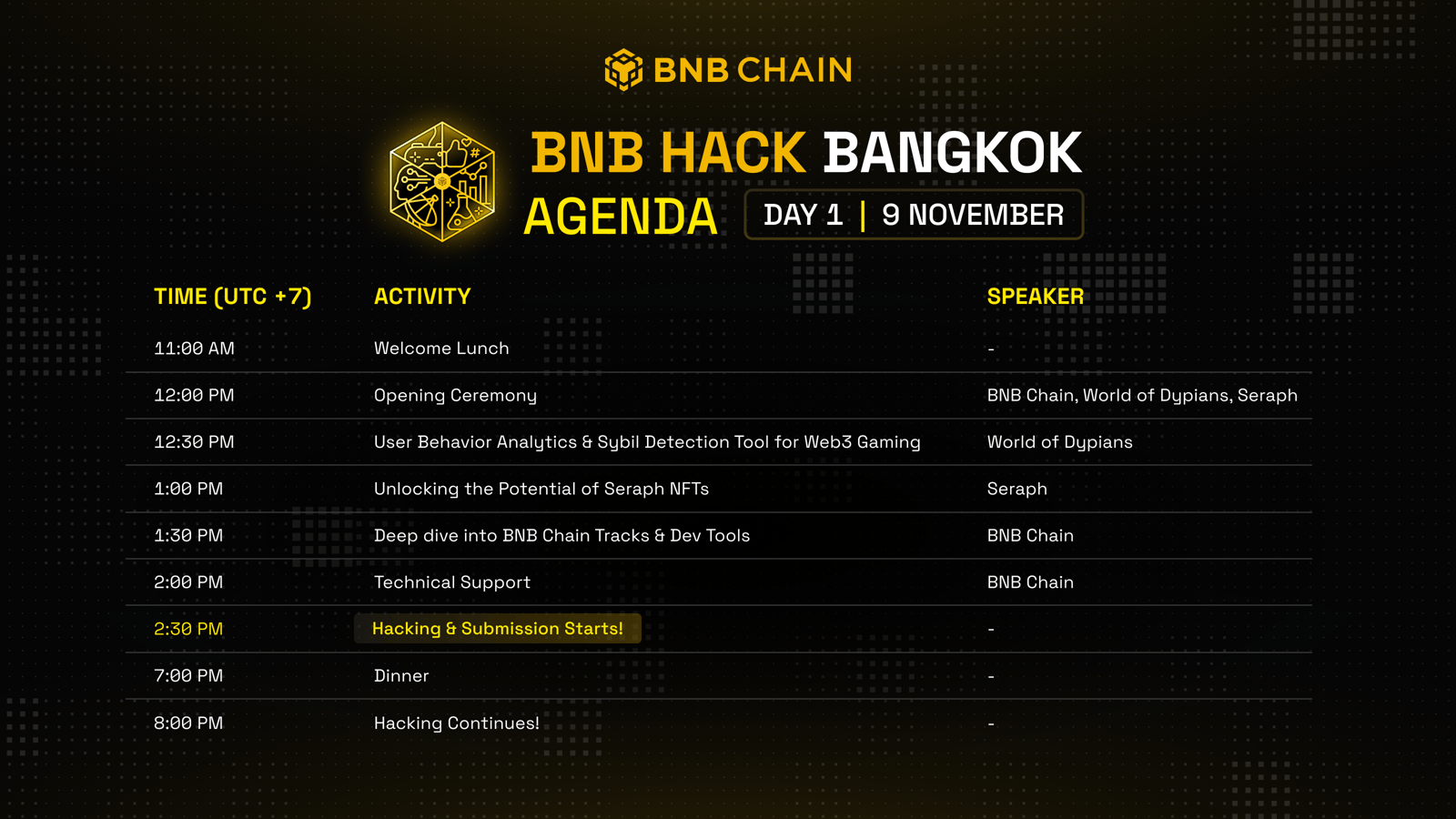 Huge shoutout to our awesome sponsors Seraph, World of Dypians, Hooked, and Cleverse, and our community support partners, DeveloperDAO, Akindo, APAC DAO, Dorahacks, 42 Blockchain, Aspecta, Pukecast, Bitcoin Addict Thailand, Hack Quest!